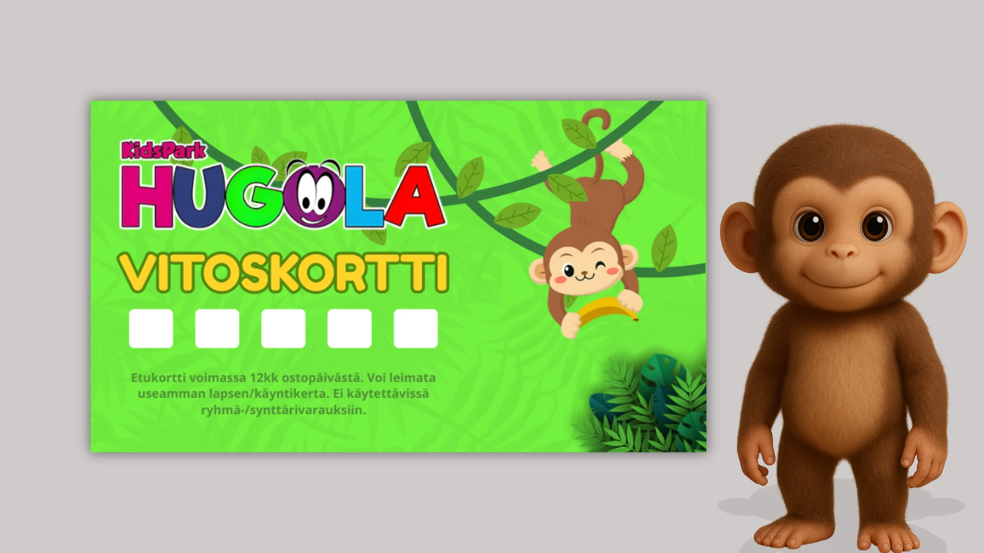 Hugolan vitoskortilla saat viisi hauskaa käyntikertaa edullisemmin! Korttia voi käyttää useampi lapsi samalla kertaa, joten se sopii täydellisesti perheille ja sisaruksille.